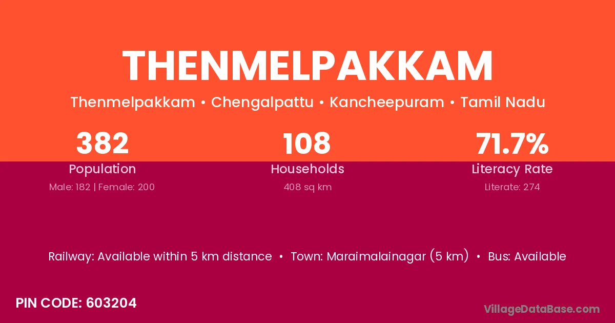 Maraimalainagar (5 km) is the nearest town to Thenmelpakkam village for major economic activities and is located approximately 5 km away.