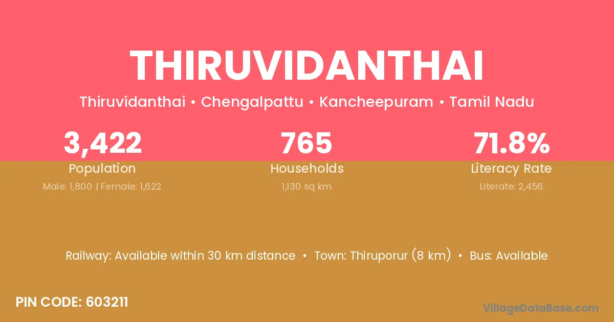 Thiruvidanthai village has a total population of 3,422 people, of which 1,800 are males and 1,622 are females.