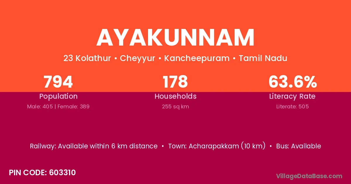 Acharapakkam (10 km) is the nearest town to Ayakunnam village for major economic activities and is located approximately 10 km away.