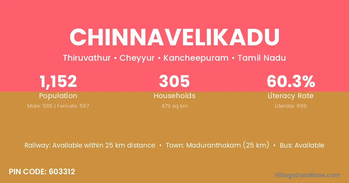 Maduranthakam (25 km) is the nearest town to Chinnavelikadu village for major economic activities and is located approximately 25 km away.