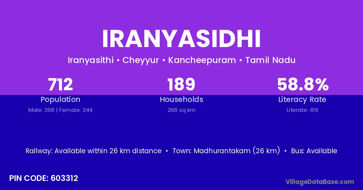 Madhurantakam (26 km) is the nearest town to Iranyasidhi village for major economic activities and is located approximately 26 km away.