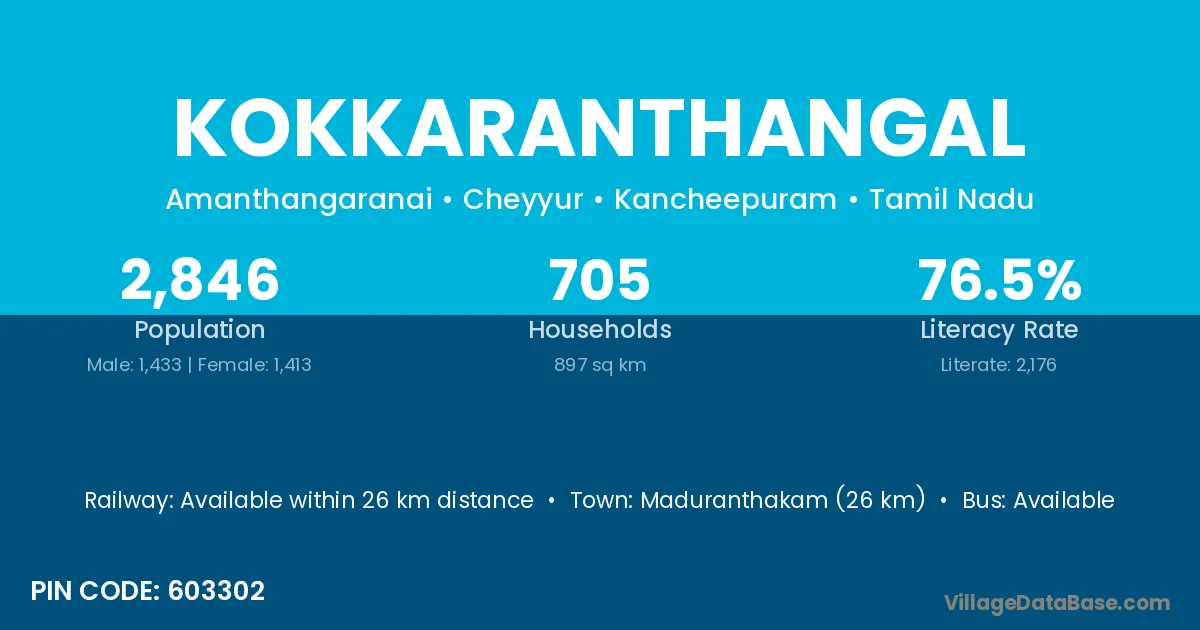 Maduranthakam (26 km) is the nearest town to Kokkaranthangal village for major economic activities and is located approximately 26 km away.