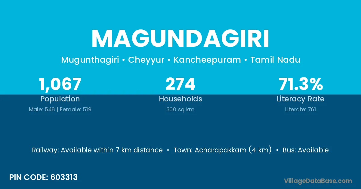Acharapakkam (4 km) is the nearest town to Magundagiri village for major economic activities and is located approximately 4 km away.
