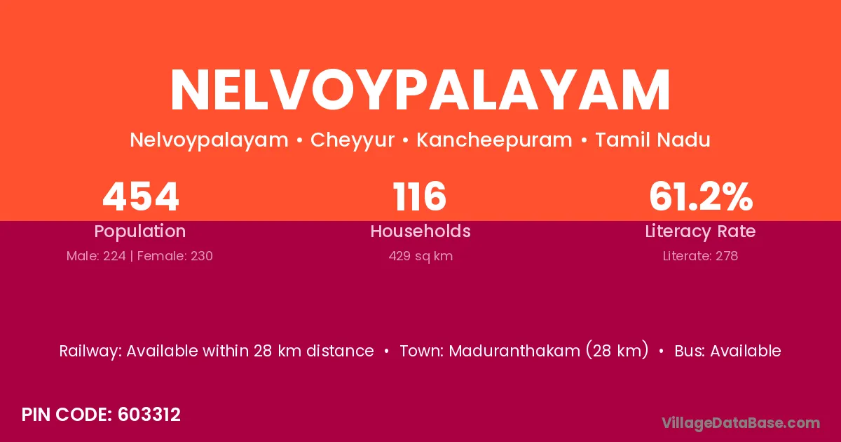 Maduranthakam (28 km) is the nearest town to Nelvoypalayam village for major economic activities and is located approximately 28 km away.