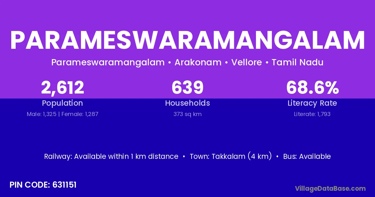 Maduranthakam (30 km) is the nearest town to Parameswaramangalam village for major economic activities and is located approximately 30 km away.