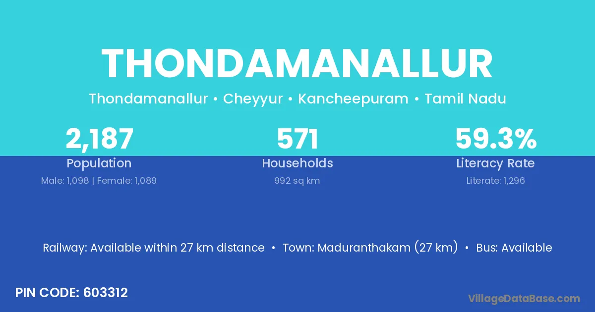 Maduranthakam (27 km) is the nearest town to Thondamanallur village for major economic activities and is located approximately 27 km away.