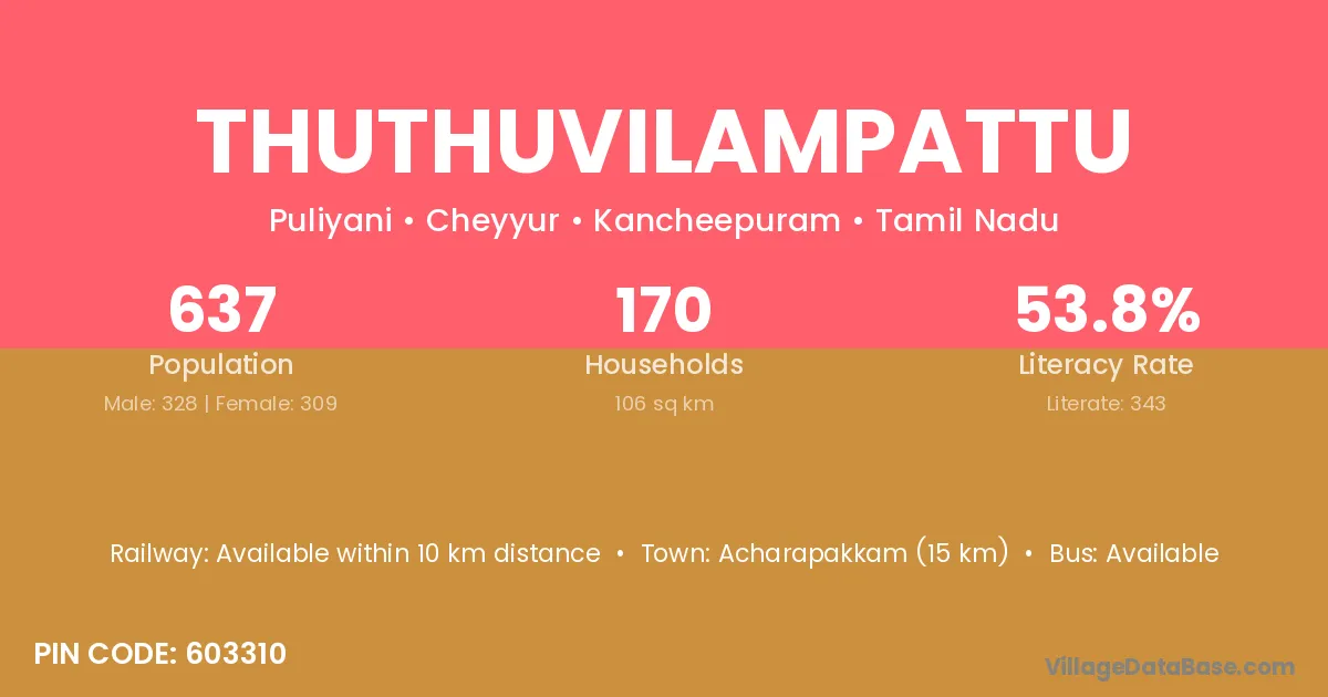 Thuthuvilampattu village has a total population of 637 people, of which 328 are males and 309 are females.