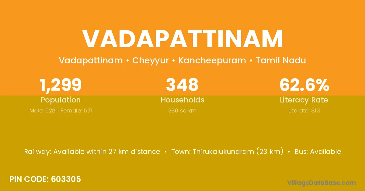 Thirukalukundram (23 km) is the nearest town to Vadapattinam village for major economic activities and is located approximately 23 km away.