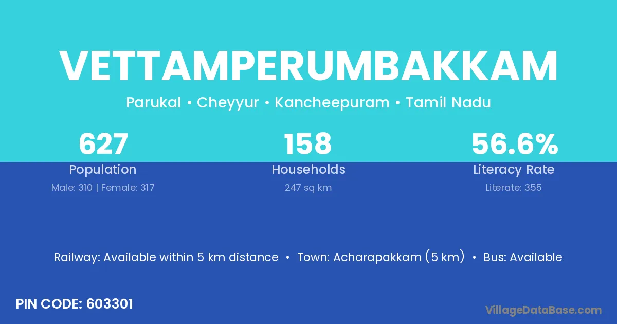 Acharapakkam (5 km) is the nearest town to Vettamperumbakkam village for major economic activities and is located approximately 5 km away.