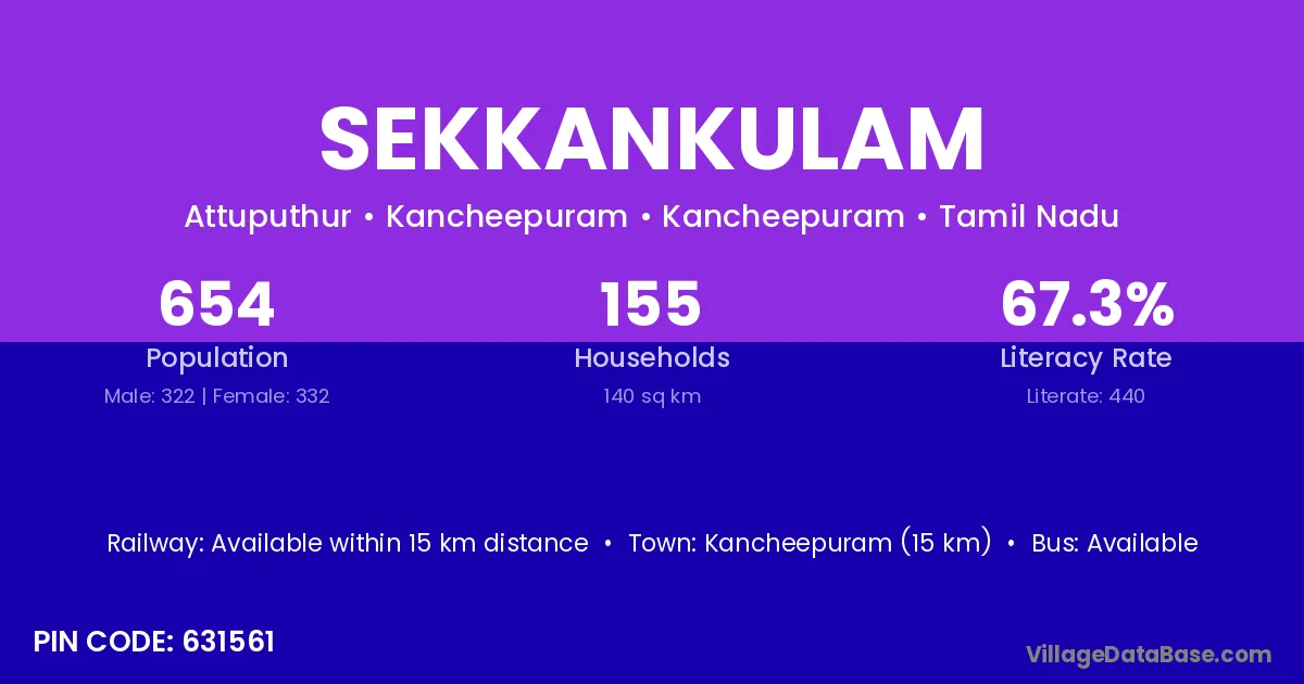 Kancheepuram (15 km) is the nearest town to Sekkankulam village for major economic activities and is located approximately 15 km away.