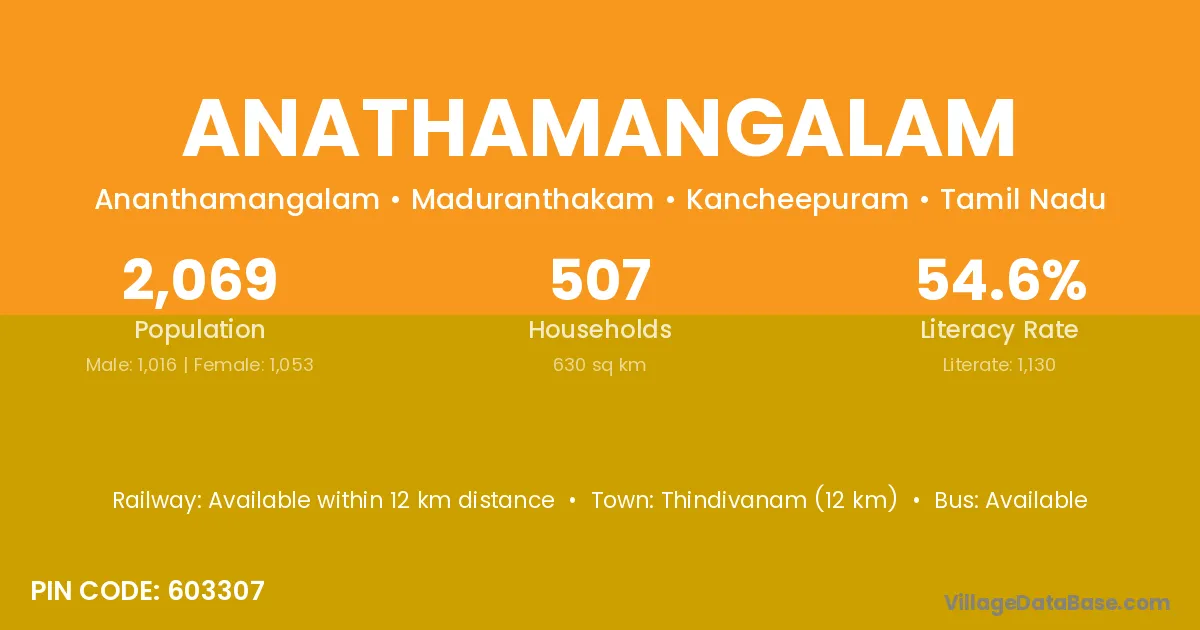 Anathamangalam village has a total population of 2,069 people, of which 1,016 are males and 1,053 are females.