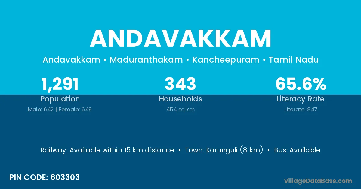 Andavakkam village has a total population of 1,291 people, of which 642 are males and 649 are females.