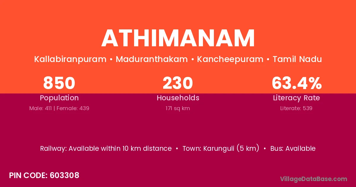 Athimanam village has a total population of 850 people, of which 411 are males and 439 are females.