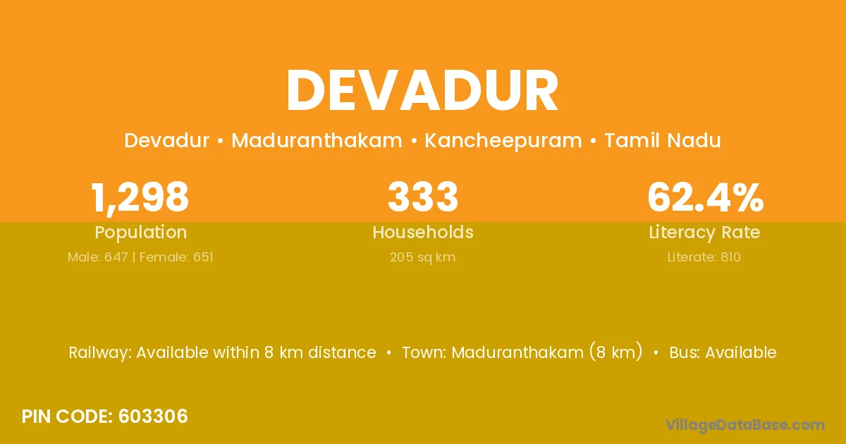 Maduranthakam (8 km) is the nearest town to Devadur village for major economic activities and is located approximately 8 km away.