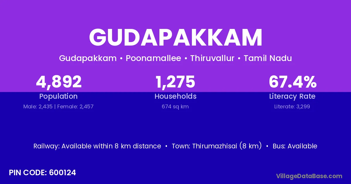 Gudapakkam village has a total population of 447 people, of which 224 are males and 223 are females.