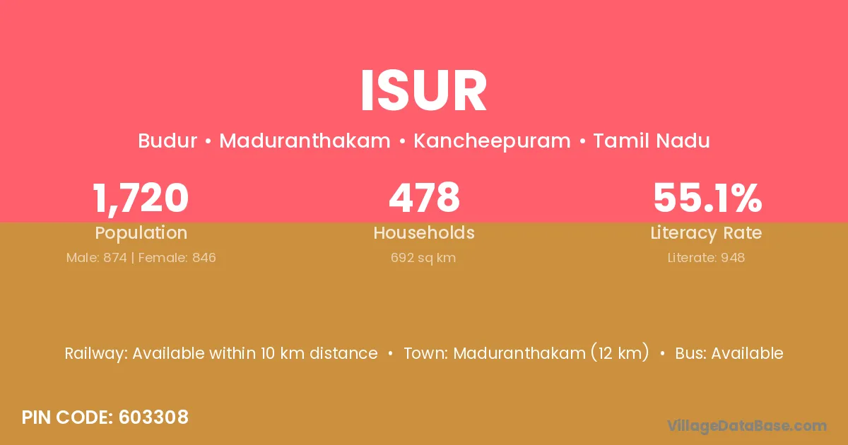 Maduranthakam (12 km) is the nearest town to Isur village for major economic activities and is located approximately 12 km away.