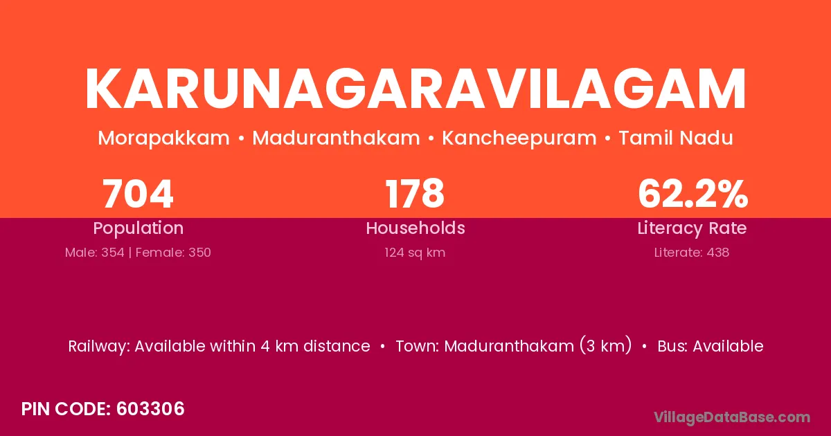 Maduranthakam (3 km) is the nearest town to Karunagaravilagam village for major economic activities and is located approximately 3 km away.