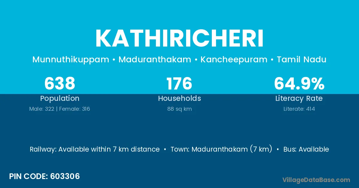 Maduranthakam (7 km) is the nearest town to Kathiricheri village for major economic activities and is located approximately 7 km away.