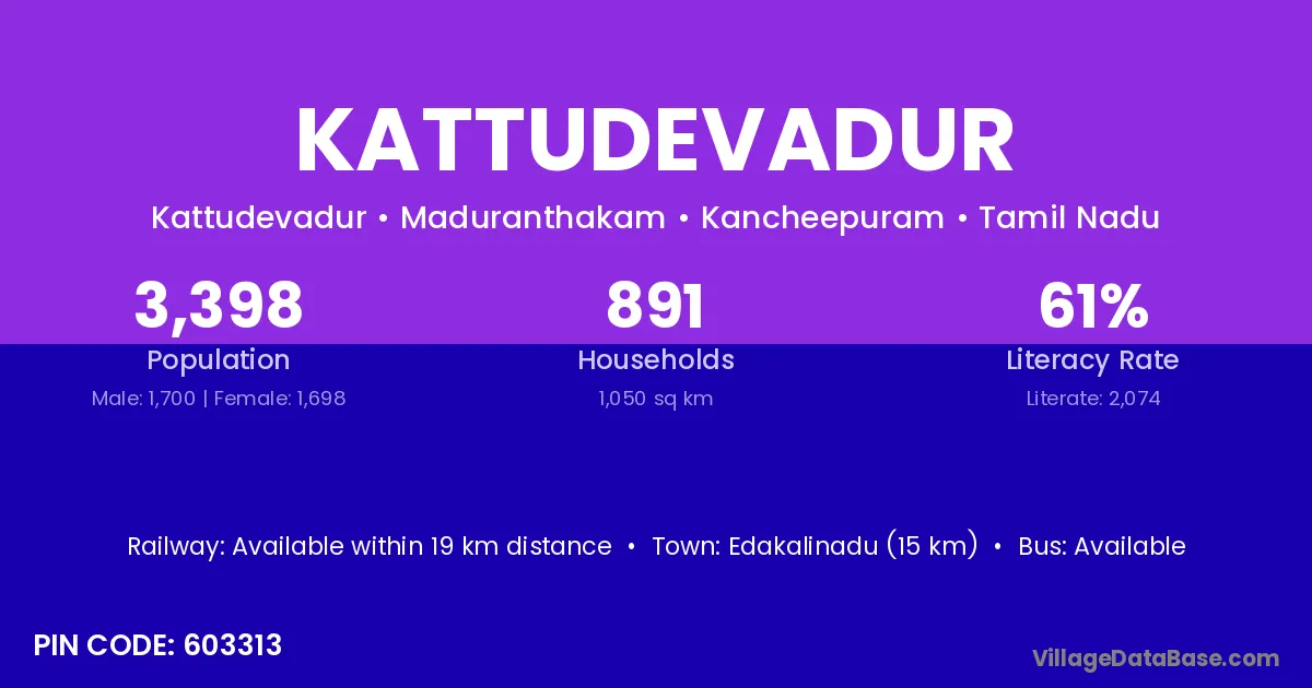 Edakalinadu (15 km) is the nearest town to Kattudevadur village for major economic activities and is located approximately 15 km away.