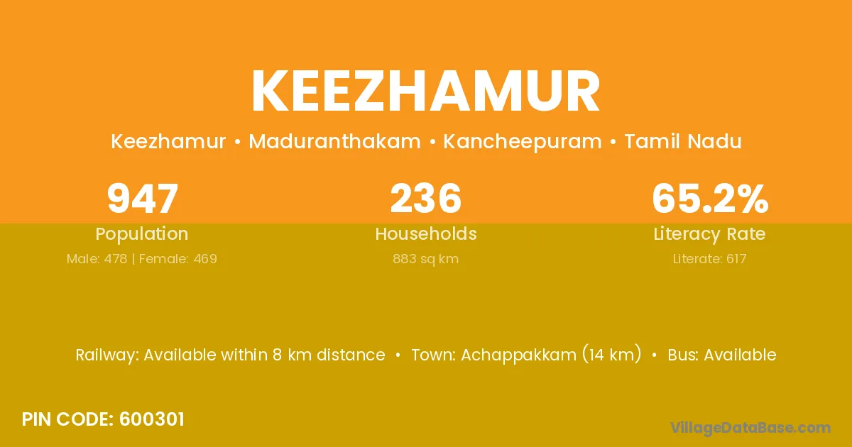 Achappakkam (14 km) is the nearest town to Keezhamur village for major economic activities and is located approximately 14 km away.