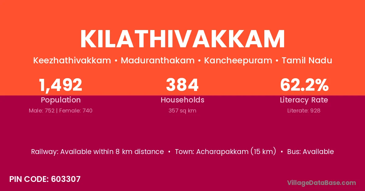 Kilathivakkam village has a total population of 1,492 people, of which 752 are males and 740 are females.