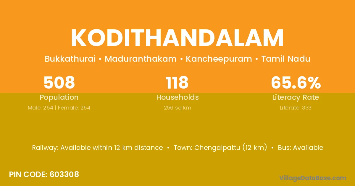 Kodithandalam village has a total population of 508 people, of which 254 are males and 254 are females.