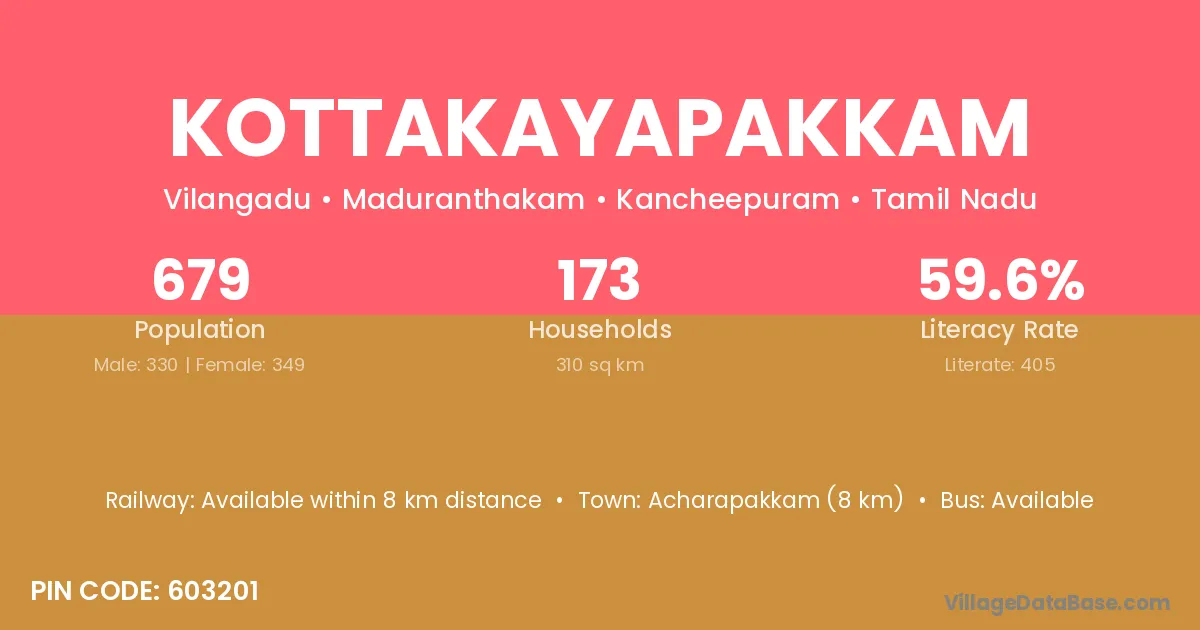 Kottakayapakkam village has a total population of 679 people, of which 330 are males and 349 are females.