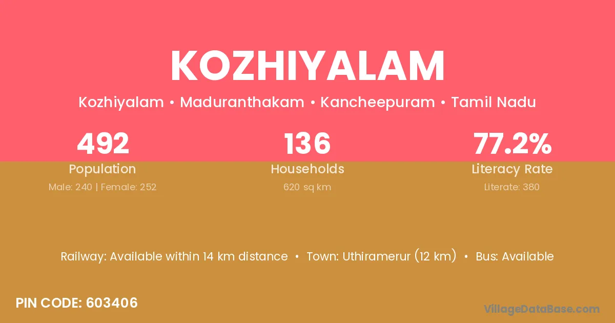 Uthiramerur (12 km) is the nearest town to Kozhiyalam village for major economic activities and is located approximately 12 km away.