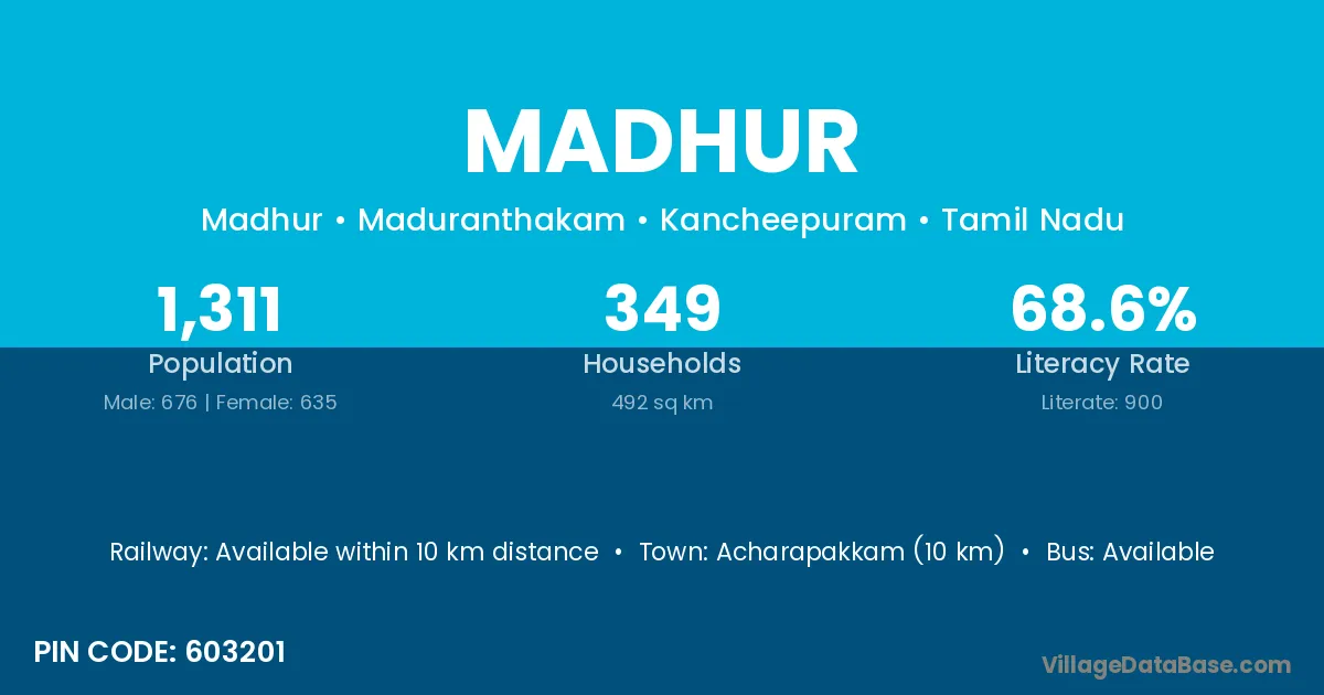 Acharapakkam (10 km) is the nearest town to Madhur village for major economic activities and is located approximately 10 km away.