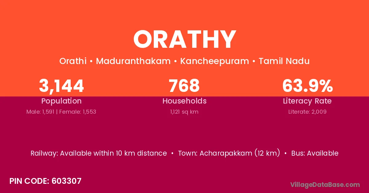 Acharapakkam (12 km) is the nearest town to Orathy village for major economic activities and is located approximately 12 km away.