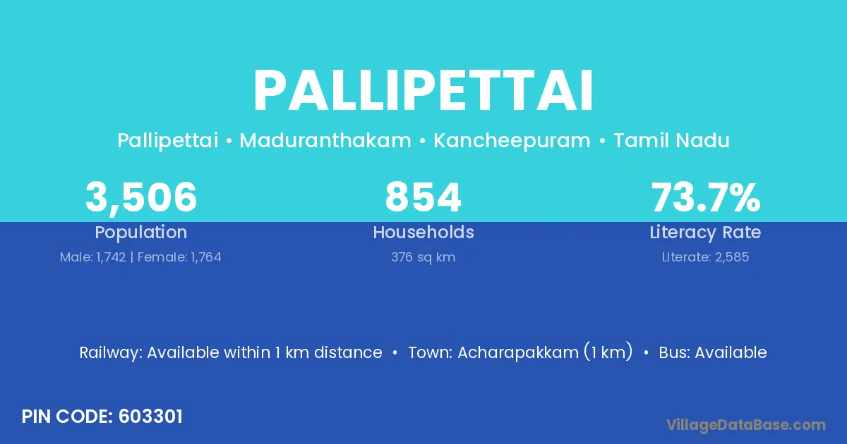 Pallipettai village has a total population of 3,506 people, of which 1,742 are males and 1,764 are females.