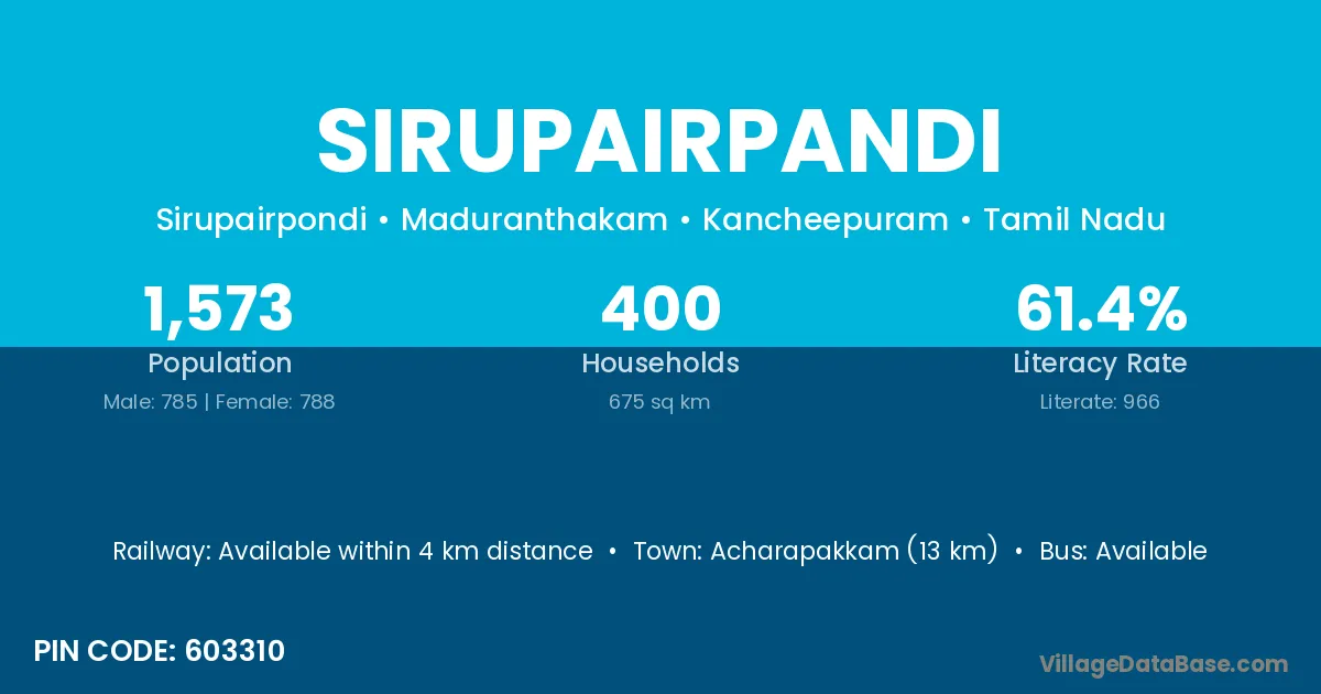 Acharapakkam (13 km) is the nearest town to Sirupairpandi village for major economic activities and is located approximately 13 km away.