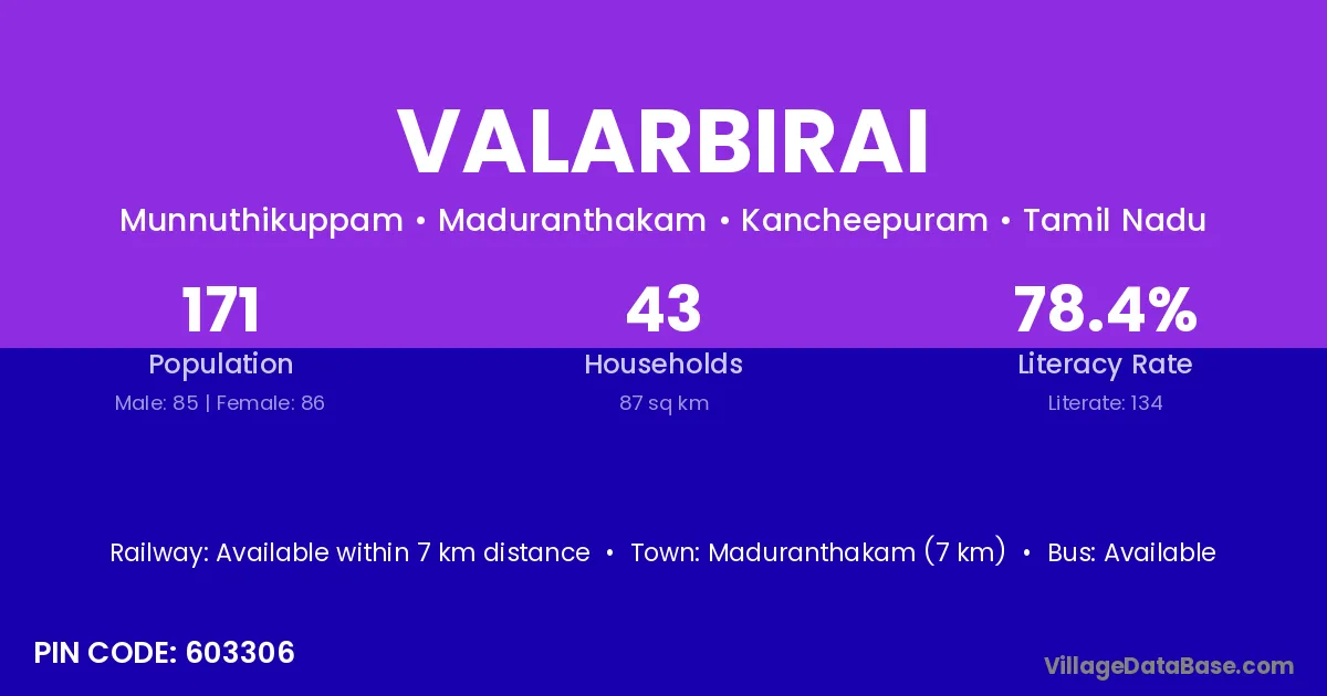 Maduranthakam (7 km) is the nearest town to Valarbirai village for major economic activities and is located approximately 7 km away.