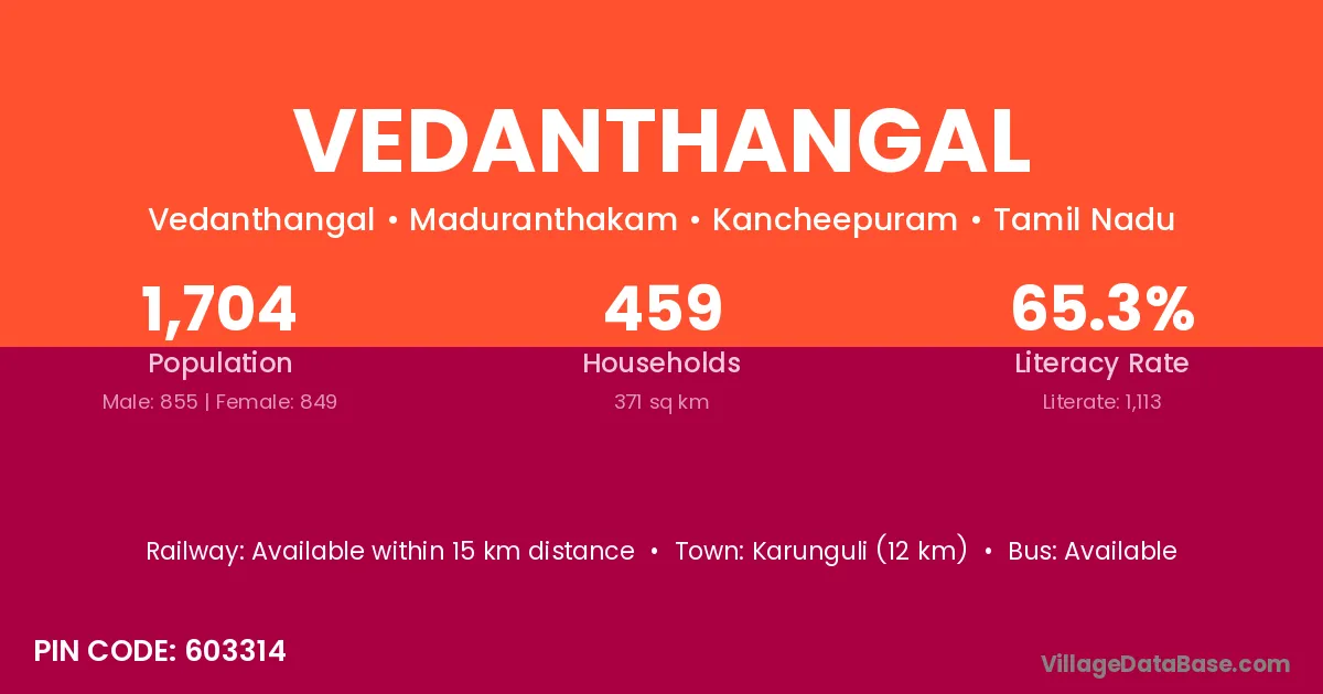 Vedanthangal village has a total population of 1,704 people, of which 855 are males and 849 are females.