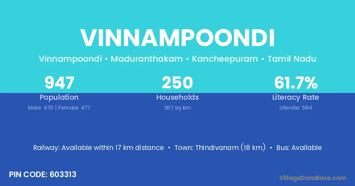 Thindivanam (18 km) is the nearest town to Vinnampoondi village for major economic activities and is located approximately 18 km away.