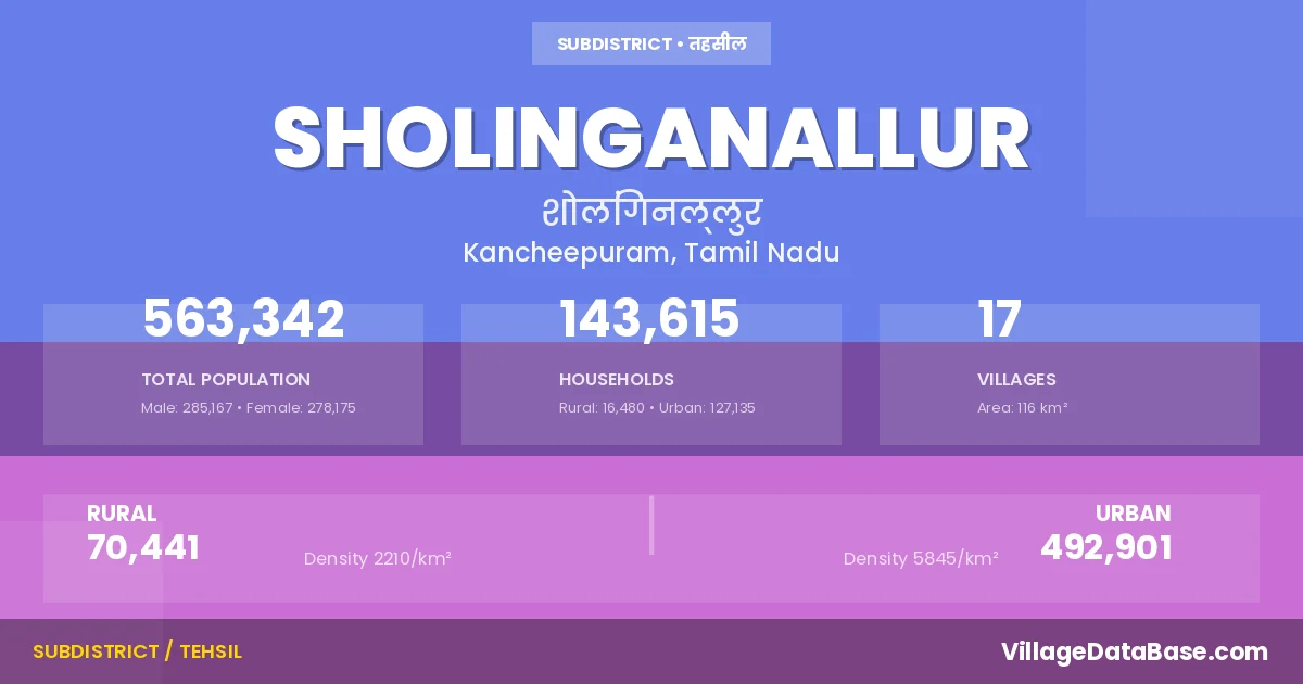 According to the 2011 census The total area of Sholinganallur Taluka is 116 km², with a population of 563342 people. The population density is 4,848 inhabitants per square kilometre, and there are approximately 143615 houses in the sub district.