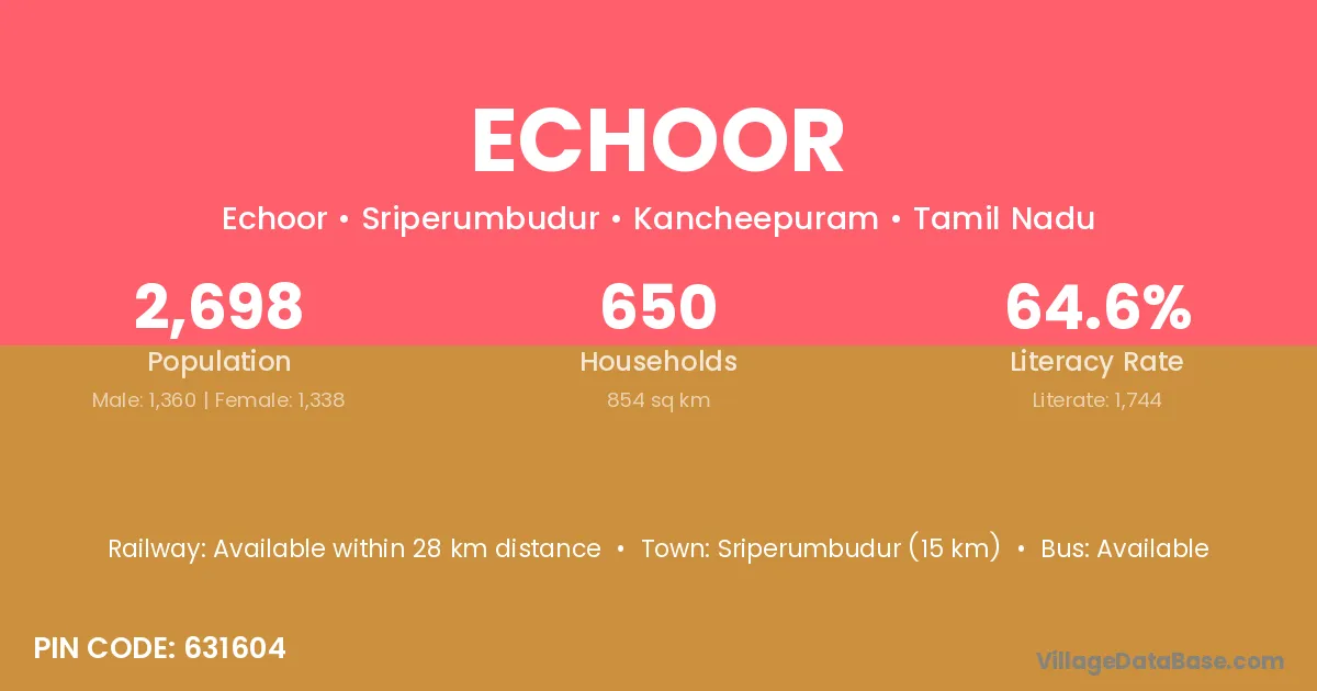 Sriperumbudur (15 km) is the nearest town to Echoor village for major economic activities and is located approximately 15 km away.