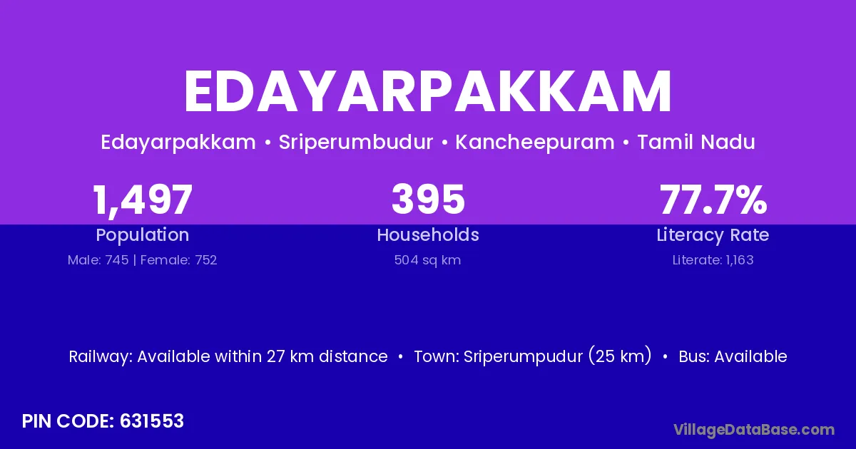 Sriperumpudur (25 km) is the nearest town to Edayarpakkam village for major economic activities and is located approximately 25 km away.