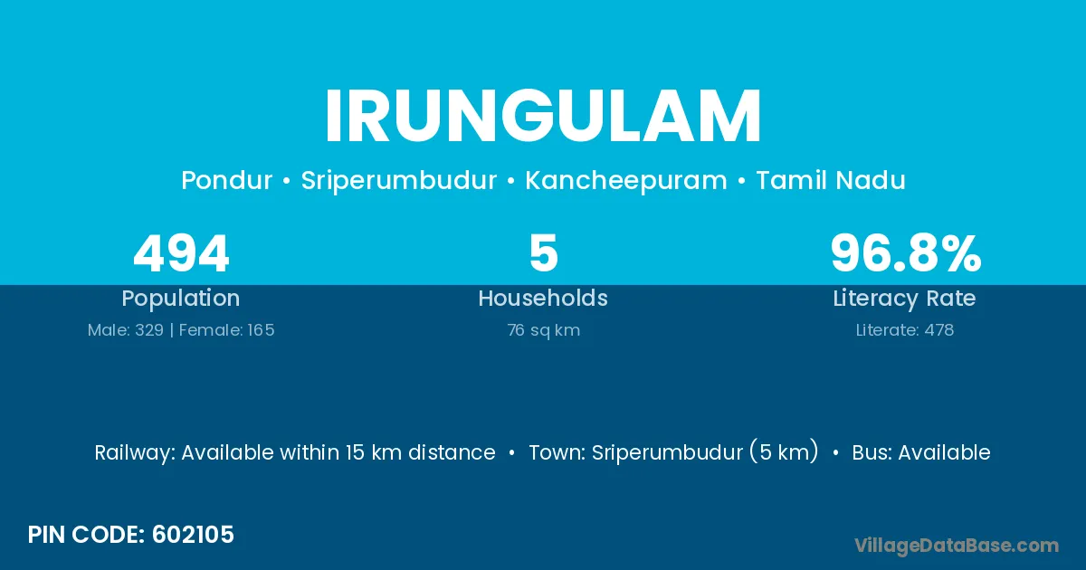 Sriperumbudur (5 km) is the nearest town to Irungulam village for major economic activities and is located approximately 5 km away.