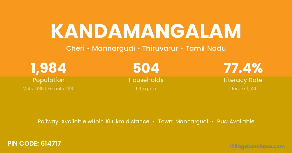 The literacy rate of Kandamangalam village is 74.73%. Male literacy stands at 79.92% and female literacy at 69.20%.