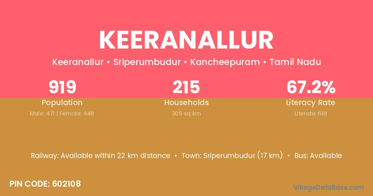 Sriperumbudur (17 km) is the nearest town to Keeranallur village for major economic activities and is located approximately 17 km away.