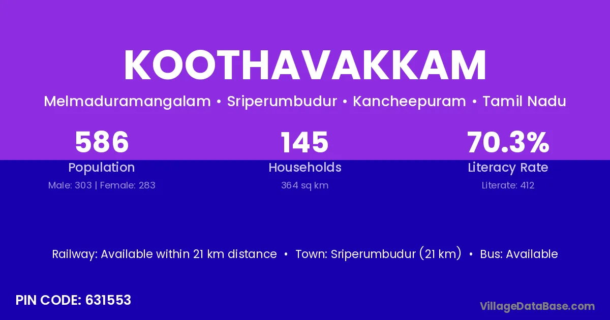 Koothavakkam village has a total population of 586 people, of which 303 are males and 283 are females.