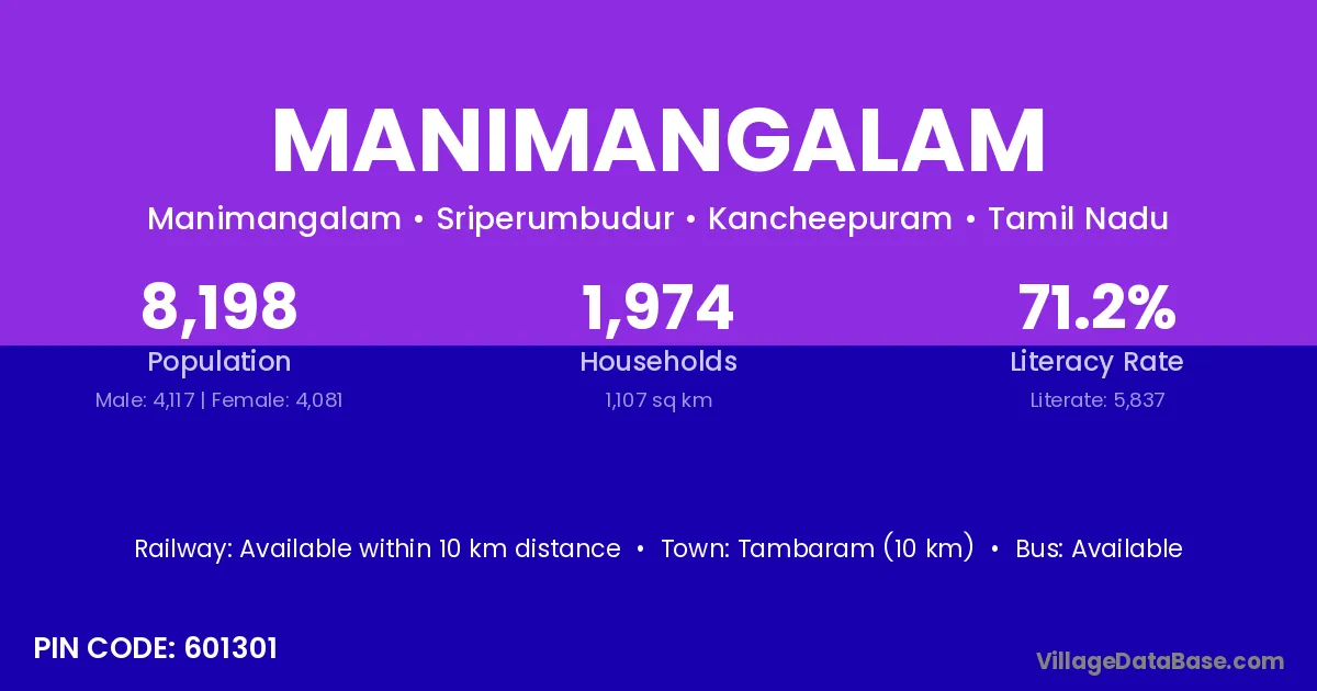 Tambaram (10 km) is the nearest town to Manimangalam village for major economic activities and is located approximately 10 km away.