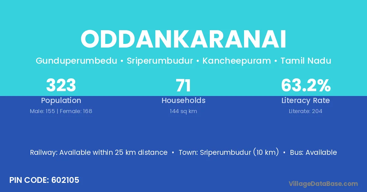 Sriperumbudur (10 km) is the nearest town to Oddankaranai village for major economic activities and is located approximately 10 km away.