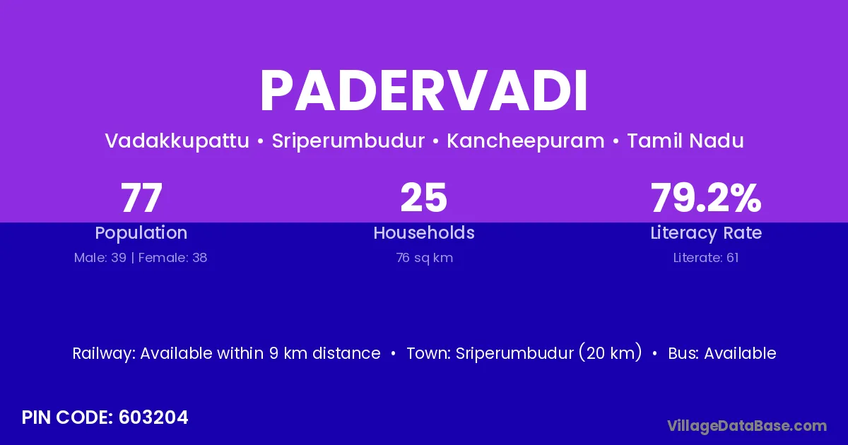 Sriperumbudur (20 km) is the nearest town to Padervadi village for major economic activities and is located approximately 20 km away.