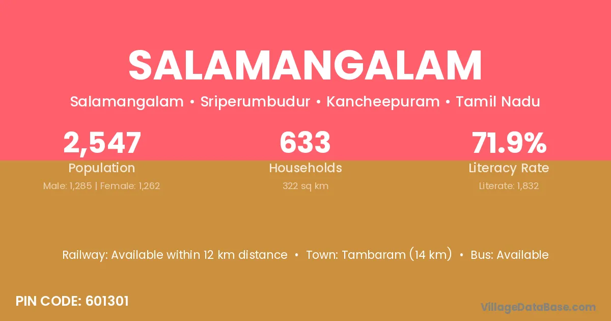 Tambaram (14 km) is the nearest town to Salamangalam village for major economic activities and is located approximately 14 km away.
