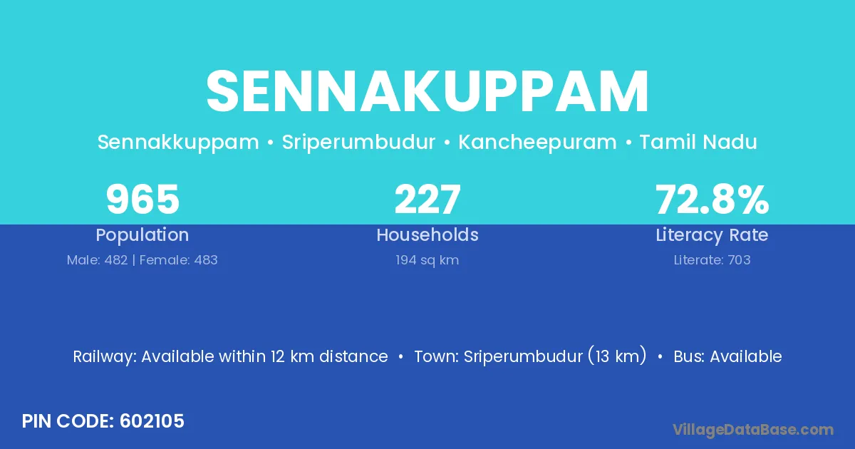 Sriperumbudur (13 km) is the nearest town to Sennakuppam village for major economic activities and is located approximately 13 km away.