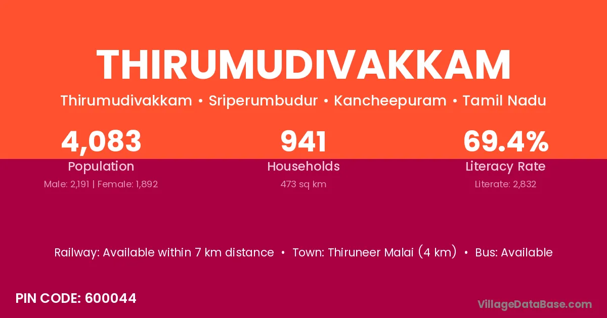 Thirumudivakkam village has a total population of 4,083 people, of which 2,191 are males and 1,892 are females.