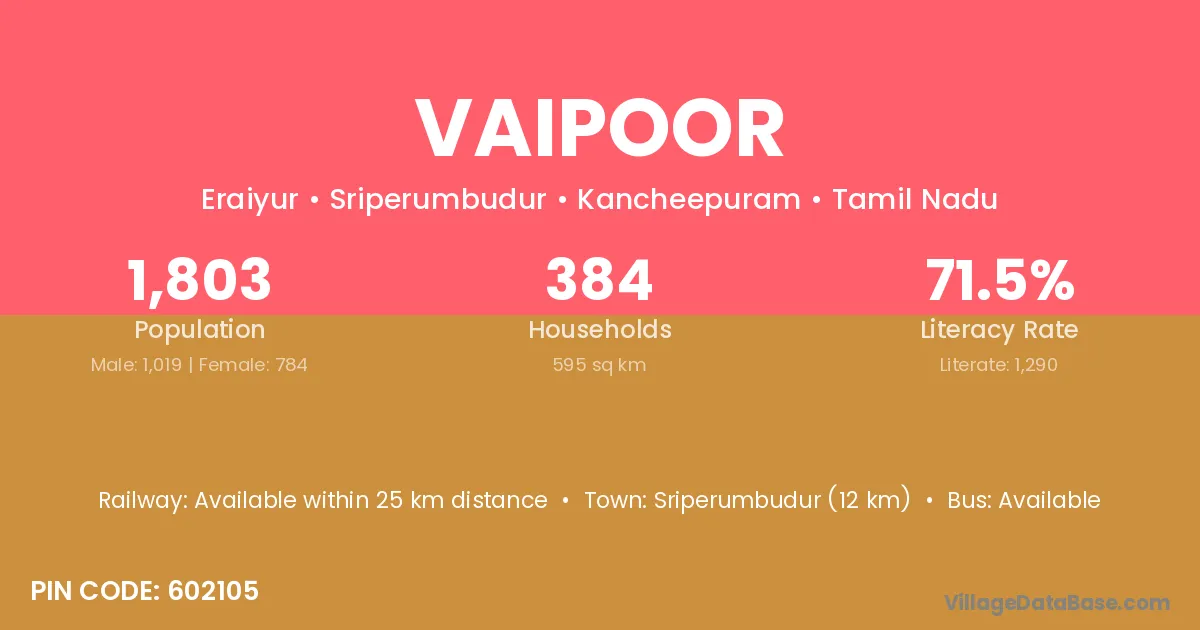 Sriperumbudur (12 km) is the nearest town to Vaipoor village for major economic activities and is located approximately 12 km away.