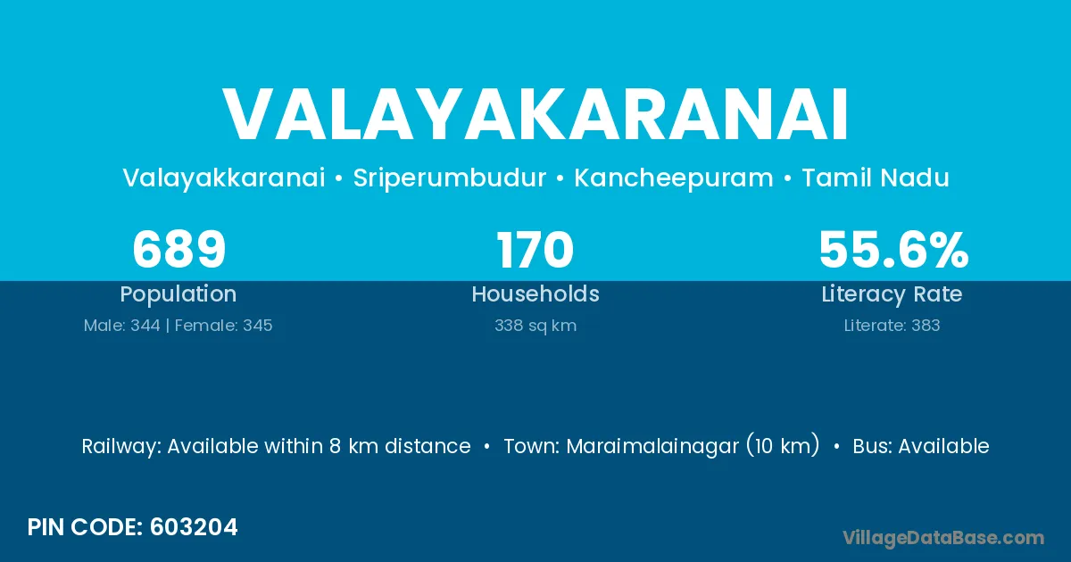 Maraimalainagar (10 km) is the nearest town to Valayakaranai village for major economic activities and is located approximately 10 km away.